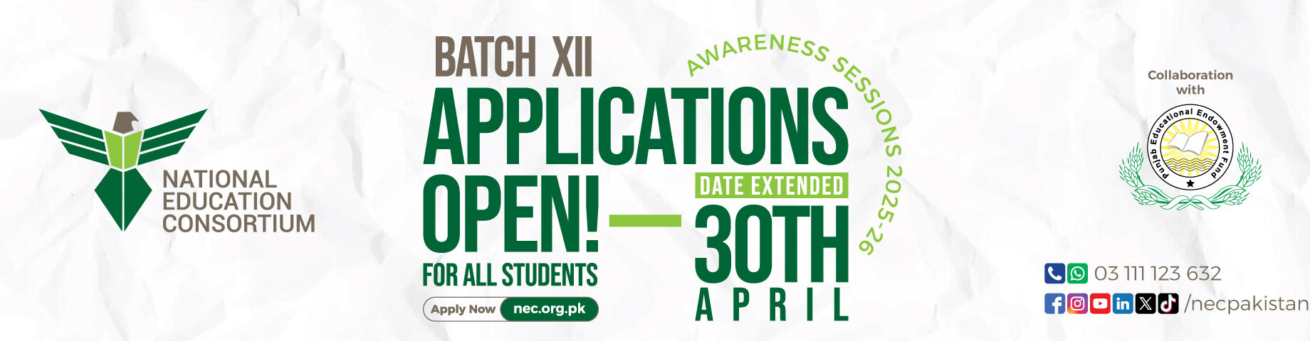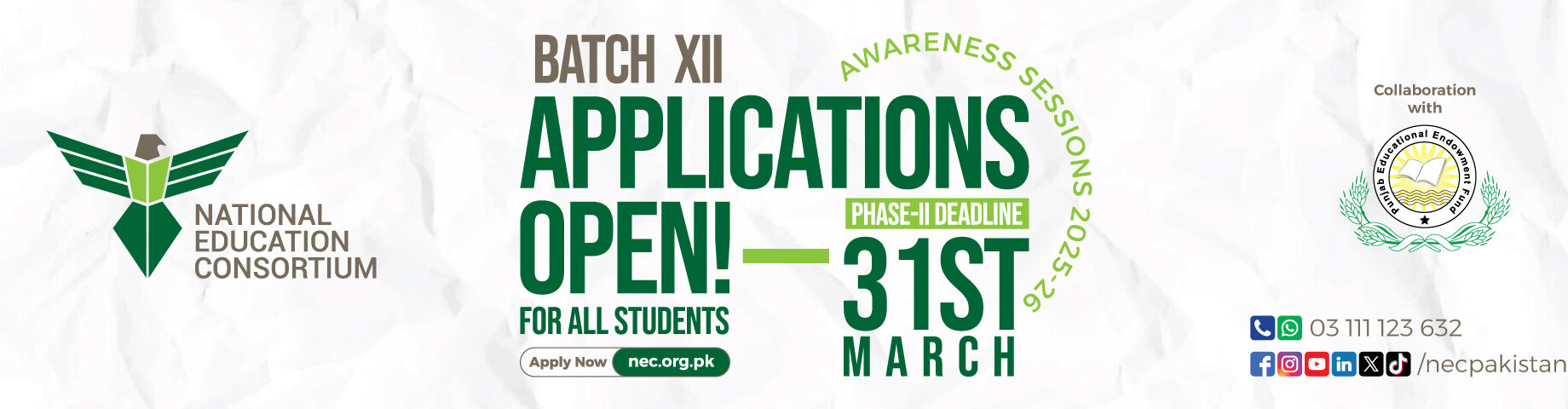 National Education Consortium (NEC) is a registered “Not for Profit” organization with a mandate to raise awareness of opportunities of higher education in Pakistan and channelize scholarships and financial aid to deserving candidates through a transparent and cost effective mechanism. Target areas of NEC are tier 2 cities of Pakistan from where talent needs to be energized to discover true potential.